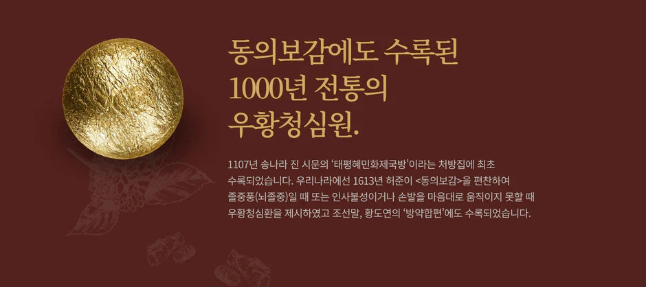 • Includes natural herbs such as Woo Hwang (Cow Bezoar), Cheong Sim (Calming Herbs), and other time-honored ingredients.
