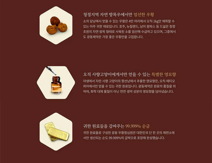 Kwangdong Woo Hwang Cheong Sim Won is a traditional herbal product crafted with care using a blend of premium natural ingredients. This product comes in convenient pill form, making it easy to consume. Its reputation is built on centuries of traditional herbal wisdom, valued for its quality and meticulous preparation.